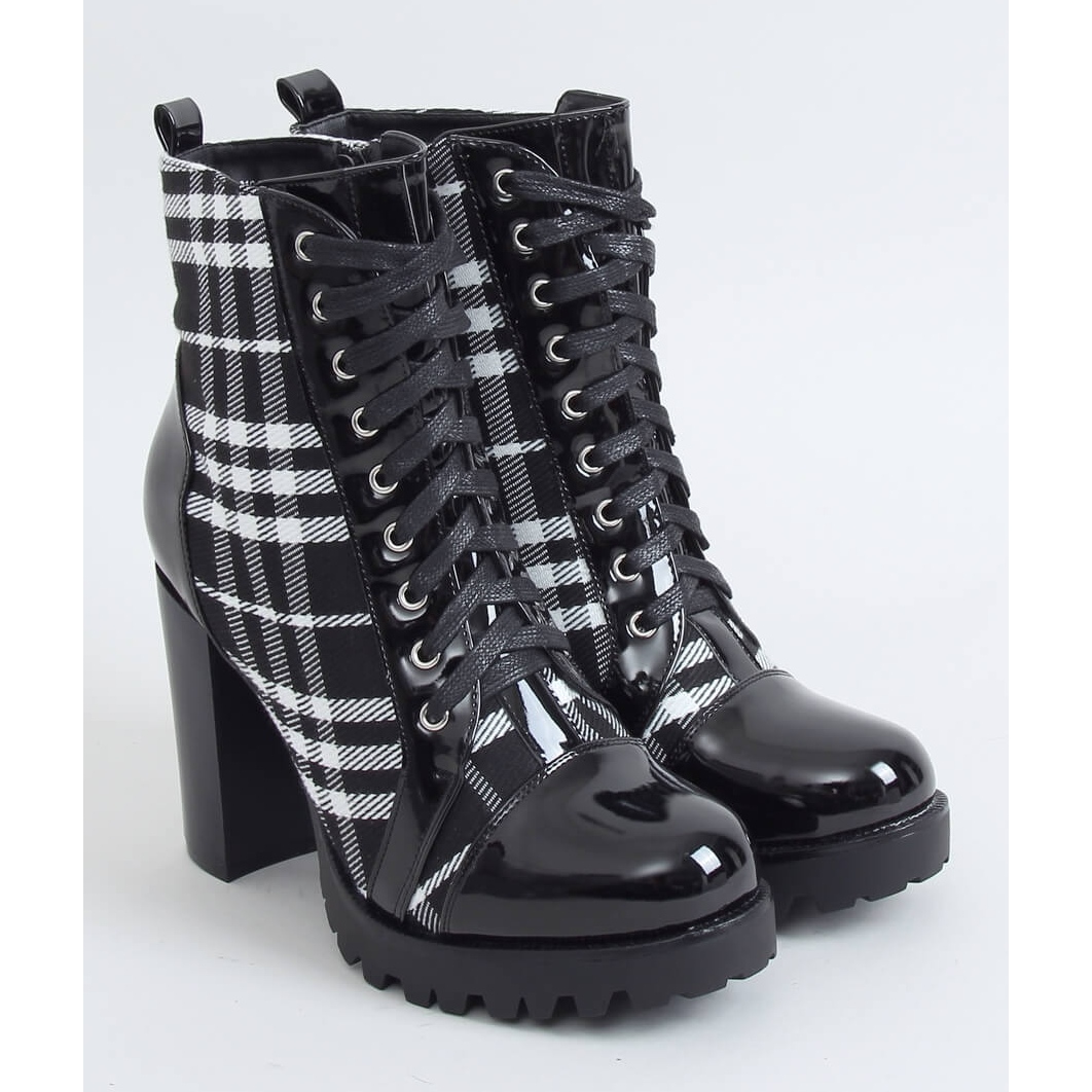 Descubra las exclusivas botas de tacón alto NS080P en negro que agregarán elegancia y elegancia a cualquiera de sus estilos. Estos impresionantes botines de mujer se distinguen no sólo por su moderno estampado de cuadros, sino también por las inserciones de charol que les dan un carácter único. La altura del tacón es de 9,5 cm y la plataforma de 2 cm, lo que garantiza una comodidad de uso y alarga visualmente las piernas.