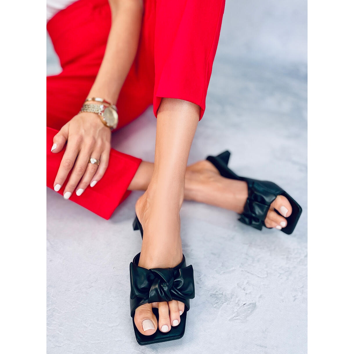 Estas chanclas se distinguen por su original diseño con puntera cuadrada y un deslumbrante lazo que les aporta un indudable encanto. El tacón de 4,5 cm de altura no sólo alarga visualmente la figura, sino que también garantiza comodidad de uso, incluso durante los largos paseos de verano.