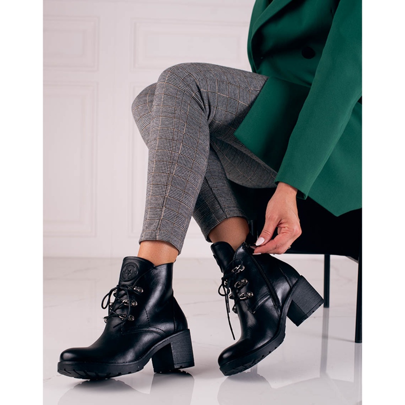 Un tacón de 6 cm de altura y una plataforma de 2 cm hacen que este modelo alarga ópticamente las piernas garantizando una estabilidad adecuada. A su vez, la puntera redonda y el ancho de la caña de 22 cm garantizan no sólo comodidad, sino también un aspecto elegante. El cierre de cordones y cremallera garantiza un ajuste perfecto.