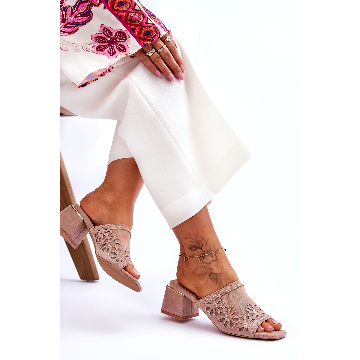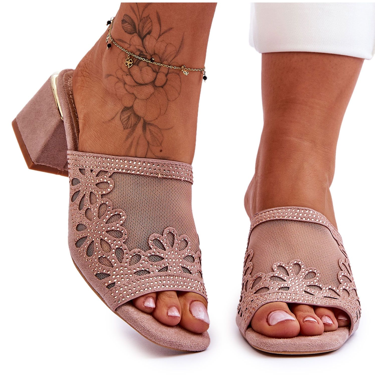 El producto es unas chanclas de tacón para mujer de S.Barski, modelo KV-612-1, en color beige, descritas por el fabricante como Nude. La punta de los zapatos tiene la puntera abierta, en línea con el clásico estilo de chanclas. La parte superior está hecha de suave cuero ecológico y material de malla, decorada con flores caladas y pedrería. La plantilla de cuero natural garantiza una gran comodidad. Un tacón en bloque de 6 cm de altura añade elegancia al tiempo que garantiza estabilidad. El producto no tiene un patrón dominante específico.