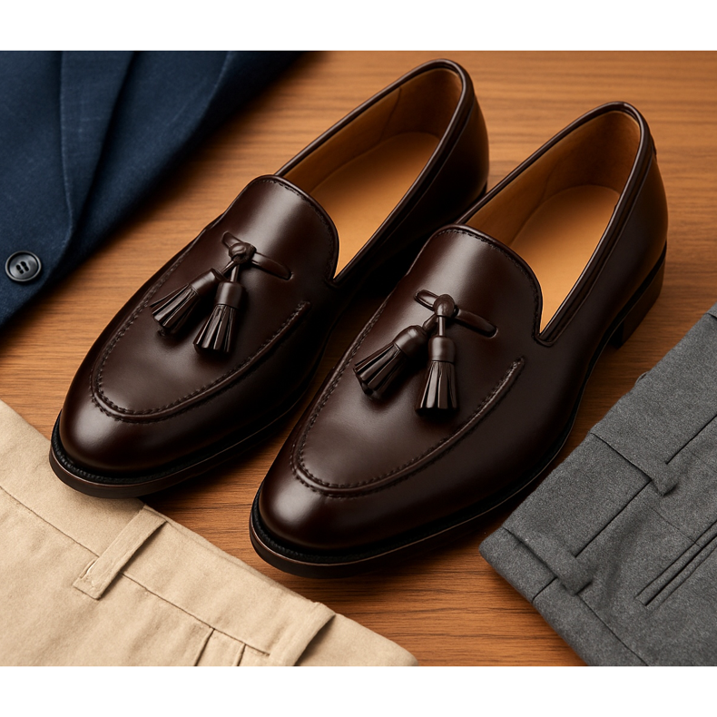 Flecos decorativos (borlas) en la parte delantera. Más expresivo que penny, pero aún así elegante.