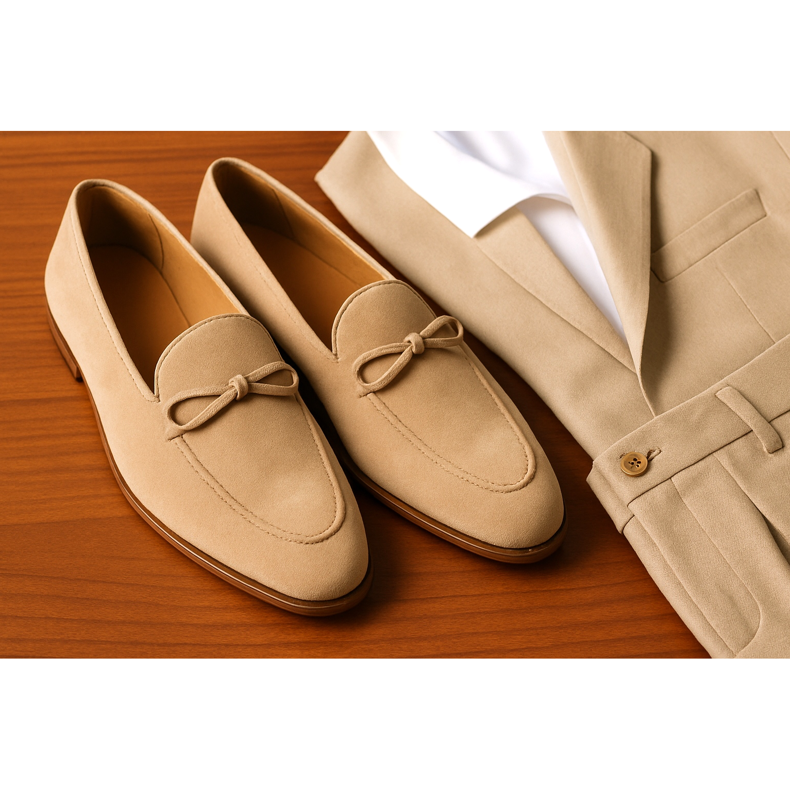 Mocasines belgas marrón claro + pantalón de lino beige + camisa de lino (sin calcetines).