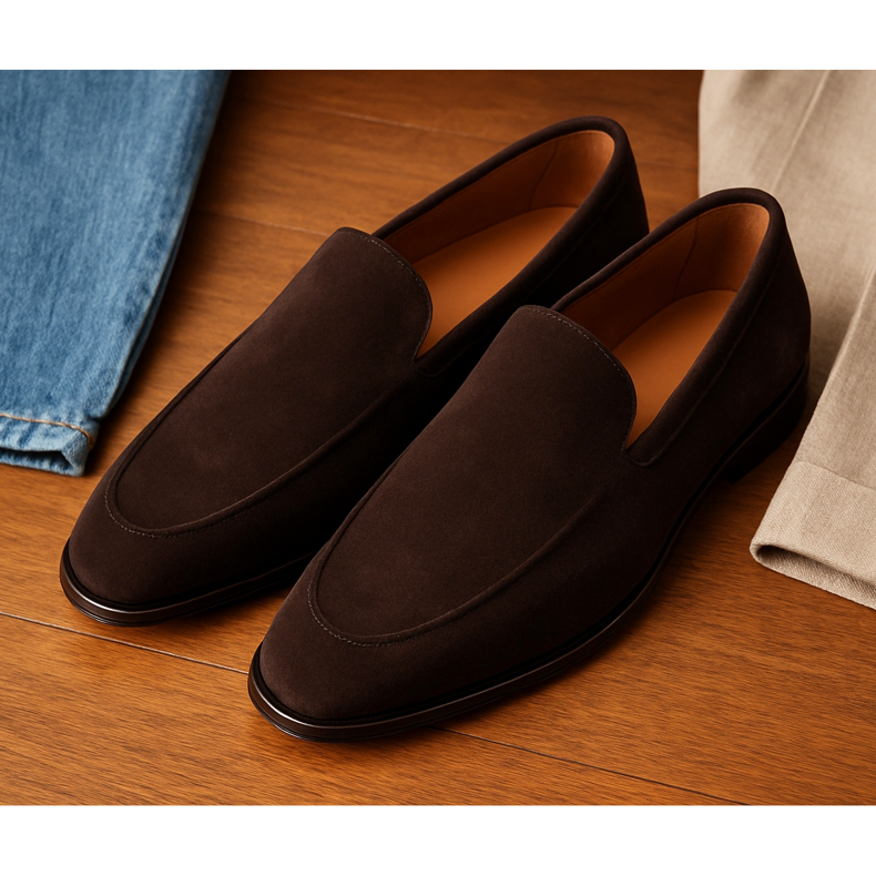 Los mocasines son zapatos sin cordones y sin cordones, originalmente usados por los nativos americanos. Los mocasines modernos son un calzado casual elegante que se caracteriza por: sin cierre, construcción de mocasín (costura alrededor de los dedos), cuero suave, suela plana o ligeramente elevada.