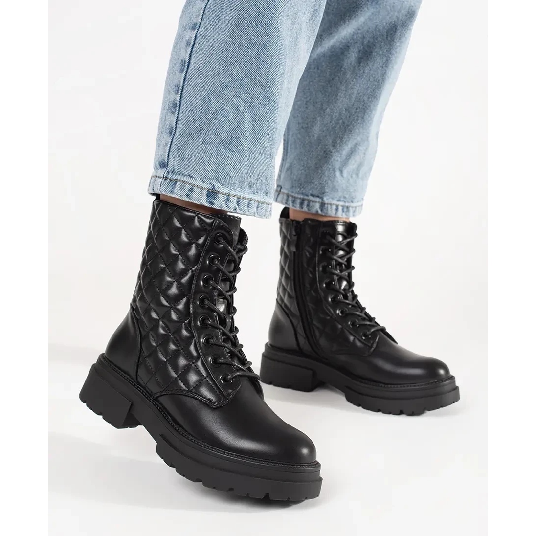 Los trabajadores acolchados negros en la plataforma son una gran opción para las mujeres que valoran el estilo y la comodidad. Estas botas de diseño extremadamente a la moda de otra marca llaman la atención con su apariencia moderna y su mano de obra de alta calidad.