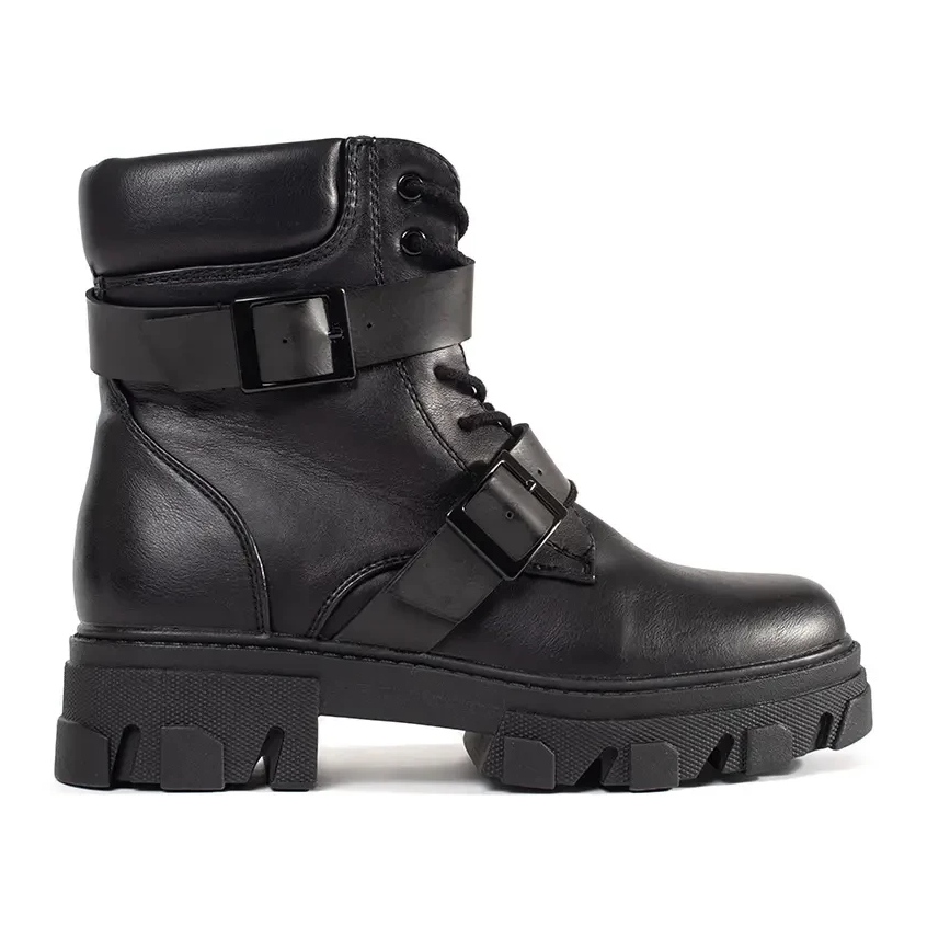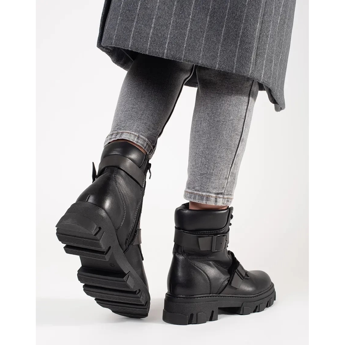El color oscuro de las botas combinado con hebillas decorativas les da un carácter único, combinando perfectamente con el estilo casual. La puntera redonda y la parte superior alta, de 24 cm de ancho, hacen que los zapatos no sólo sean estéticos, sino también prácticos. Una ventaja adicional es el cierre de cremallera, hebilla y cordones, que permite ponérselo y quitárselo fácilmente.