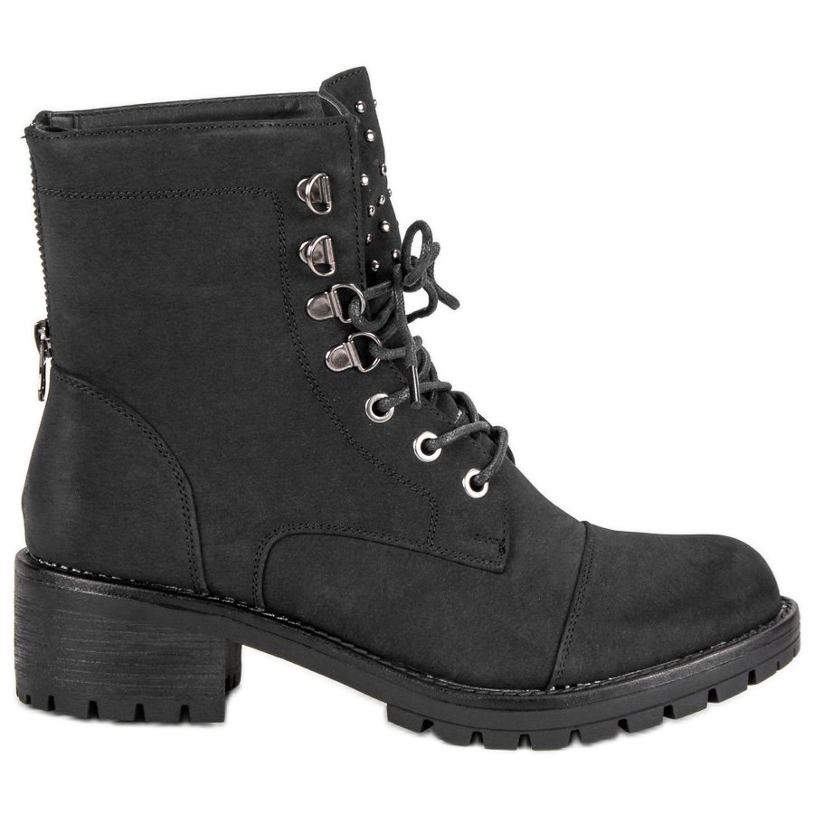 Los botines VINCEZA negros se distinguen por una pala alta, cordones y una cremallera decorativa en la parte trasera, lo que les da un carácter único. Un tacón delicado y estable de 5 cm de altura y una plataforma de 2 cm garantizan comodidad durante todo el día. La puntera redonda y el talón rígido integrado son ventajas adicionales que contribuyen a la comodidad y un look moderno.