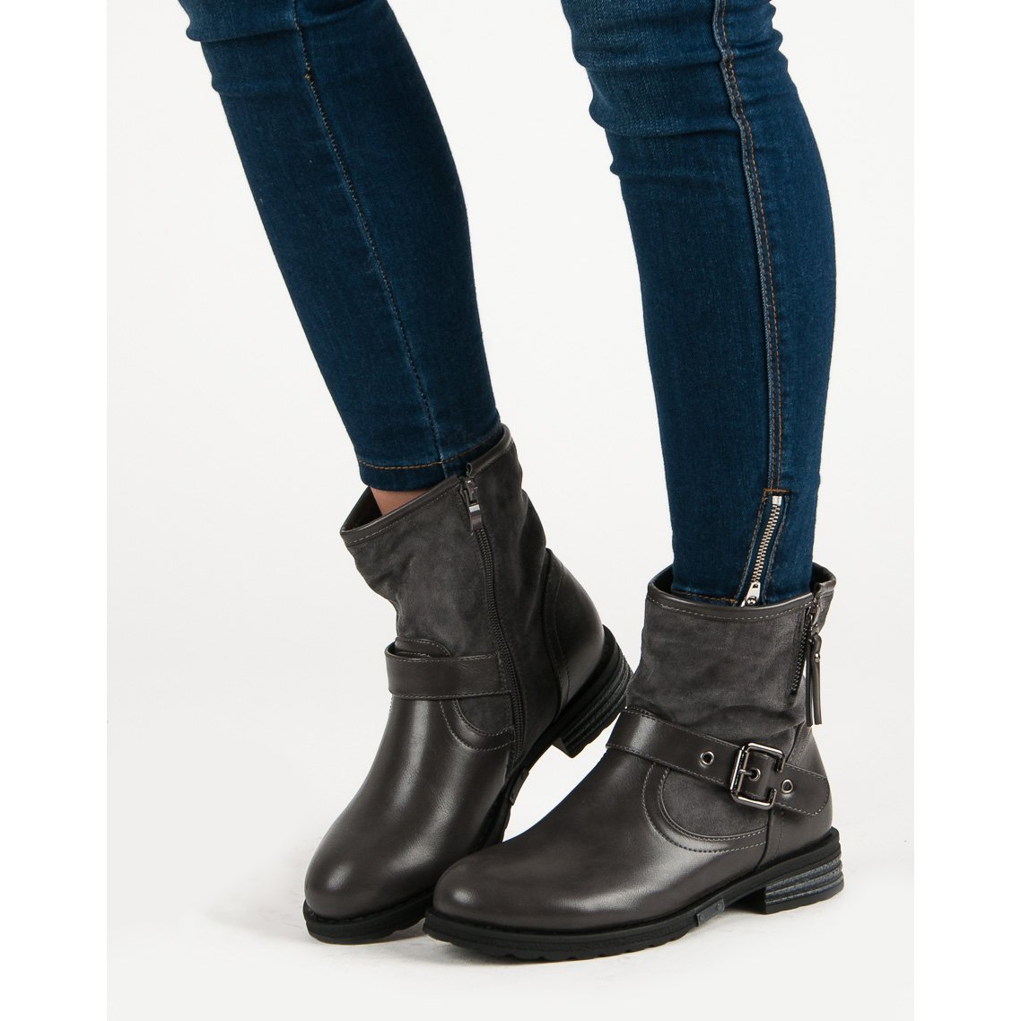 Confeccionados en ecopiel gris y ante ecológico de alta calidad, estos trabajadores convencen por su diseño elegante y rockero. Los adornos metálicos, que incluyen una llamativa hebilla y cremallera, añaden un toque de vanguardia, convirtiéndolos en un elemento insustituible de todo guardarropa. La suela gruesa y con dibujo no sólo proporciona un excelente agarre, sino también comodidad durante largas caminatas.