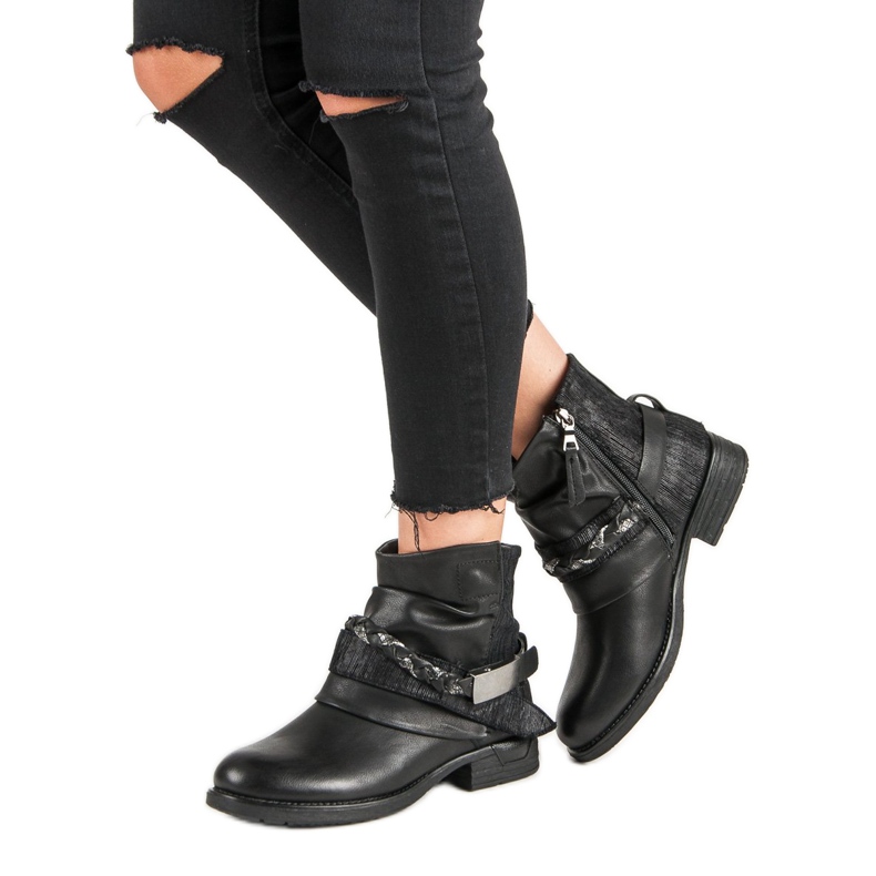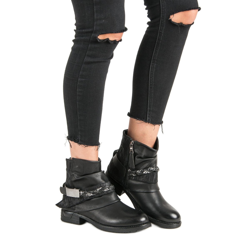 Este modelo se distingue no sólo por su funcionalidad, sino también por su diseño original. La parte superior de los zapatos está enriquecida con diversas texturas de piel, lo que les confiere un carácter único. Una ventaja adicional es el elegante cinturón trenzado con hebilla decorativa, que realza la estética rockera. Un tacón plano de 3 cm de altura hace que los trabajadores sean extremadamente cómodos durante el uso, perfecto para el estilo diario.