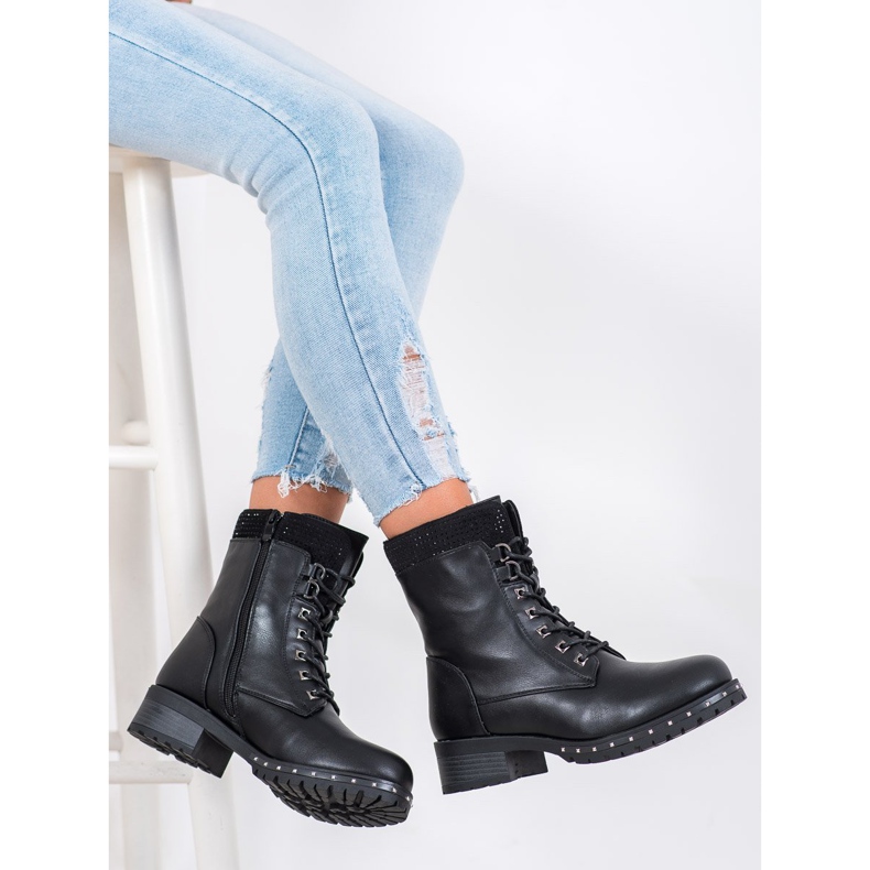 La parte superior de 16 cm de altura protege eficazmente contra las condiciones climáticas desfavorables y la puntera redonda aporta sutileza. Una suela sintética alta y plana, de 2 cm de espesor, garantiza estabilidad y comodidad en cada paso. Además, los pedrería y las tachuelas en la parte superior son un acento elegante que le da a los zapatos un carácter rockero.