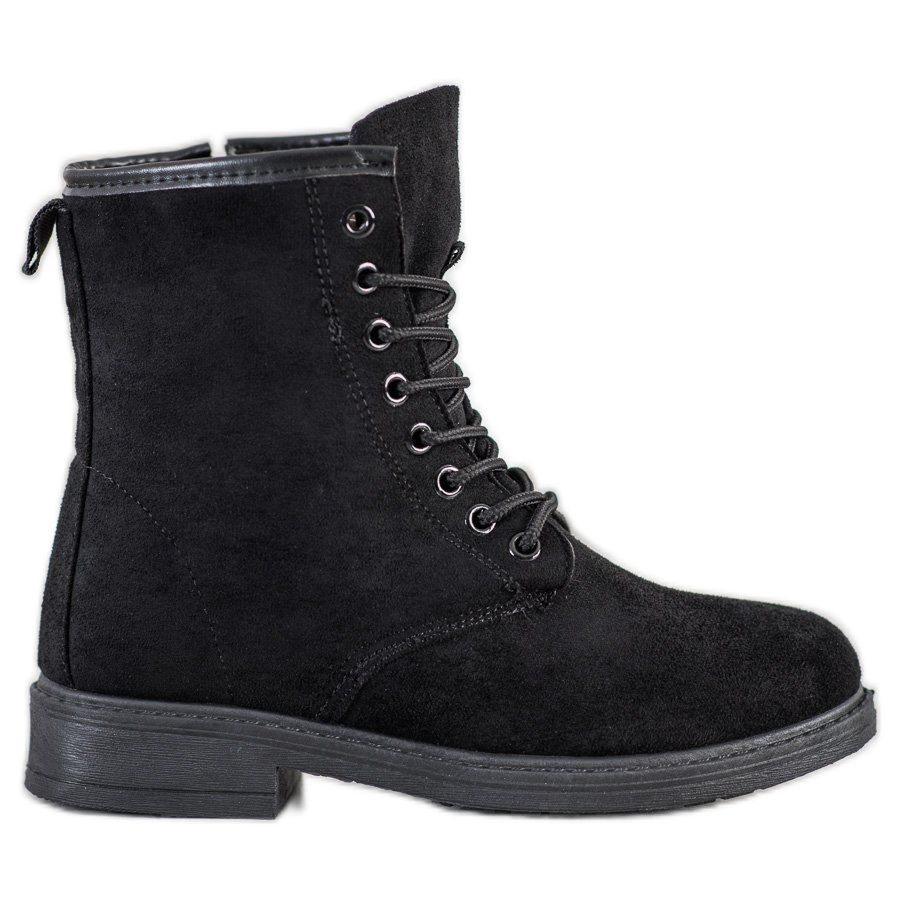 Fabricadas en piel de ante ecológica, las botas son estéticas y respetuosas con el medio ambiente. Su color negro los hace combinar con muchos conjuntos diferentes y la punta redonda les da un carácter ligeramente informal. El interior de los zapatos está relleno de un tejido suave, lo que garantiza la comodidad de uso, y el aislamiento permite un uso cómodo en los días más fríos.