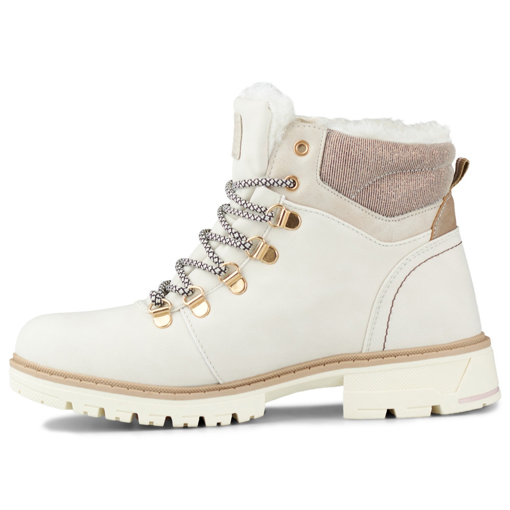 Estas elegantes zapatillas en un delicado tono beige son la elección perfecta para la temporada otoño/invierno. Diseñados pensando en las mujeres, combinan comodidad, funcionalidad y diseño de moda. La parte superior del trampero está hecha de cuero ecológico duradero, lo que le da al calzado un aspecto elegante. La altura superior de 11 cm proporciona protección adicional contra el frío, perfecta para los días de invierno. El interior de los tramperos está forrado con piel ecológica, lo que los hace extremadamente agradables y cálidos de llevar. El aislamiento adicional garantiza comodidad en los días más fríos. Un pequeño tacón de 3 cm de altura añade un carácter femenino a los zapatos y al mismo tiempo los mantiene estables. Las botas tienen cordones prácticos, que permiten un fácil ajuste a las necesidades individuales y garantizan un ajuste seguro. La punta redonda hace que estos zapatos sean cómodos y adecuados para muchos estilos. El color beige los hace universales, lo que permite combinarlos fácilmente con diversas prendas de vestuario.