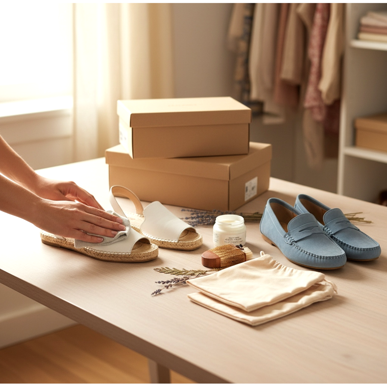 Antes de guardar tus zapatos de verano para la temporada, asegúrate de que estén limpios y secos. Cualquier rastro de suciedad o sudor puede provocar manchas u olores permanentes. Límpialas con un paño limpio y déjalas secar por completo. Si tus zapatos son de gamuza o cuero, aplica una loción protectora. Recuerde guardarlos en un lugar fresco y seco, nunca a la luz del sol, que puede decolorar los zapatos. Si puedes, guárdalas en cajas o bolsas de tela para protegerlas del polvo.
