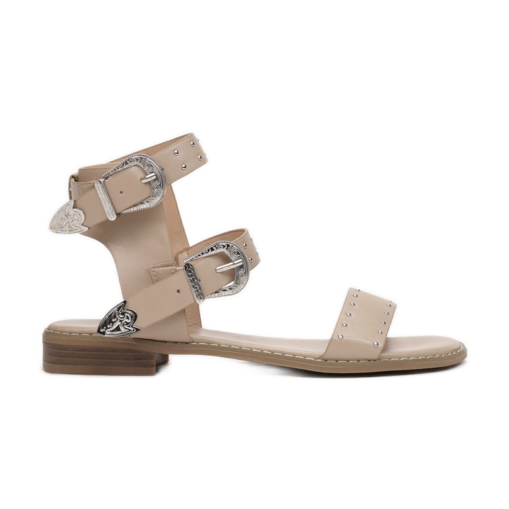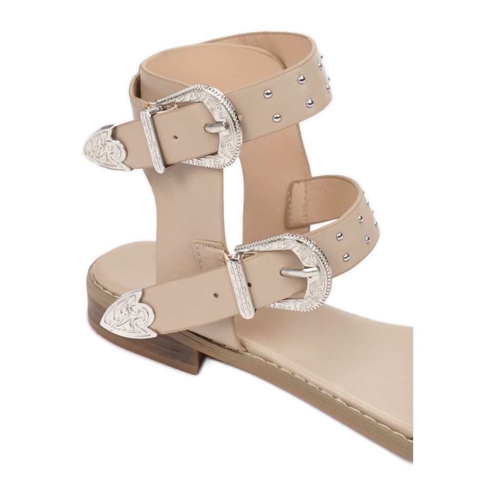 El diseño de las sandalias deleita con tiras anchas en la puntera y el tobillo, que están decoradas con remaches y llamativas hebillas, dándoles un acabado elegante. Fabricadas en ecopiel de alta calidad, tanto el corte como la plantilla garantizan durabilidad y facilidad de cuidado, lo que las convierte en una solución práctica para el día a día.