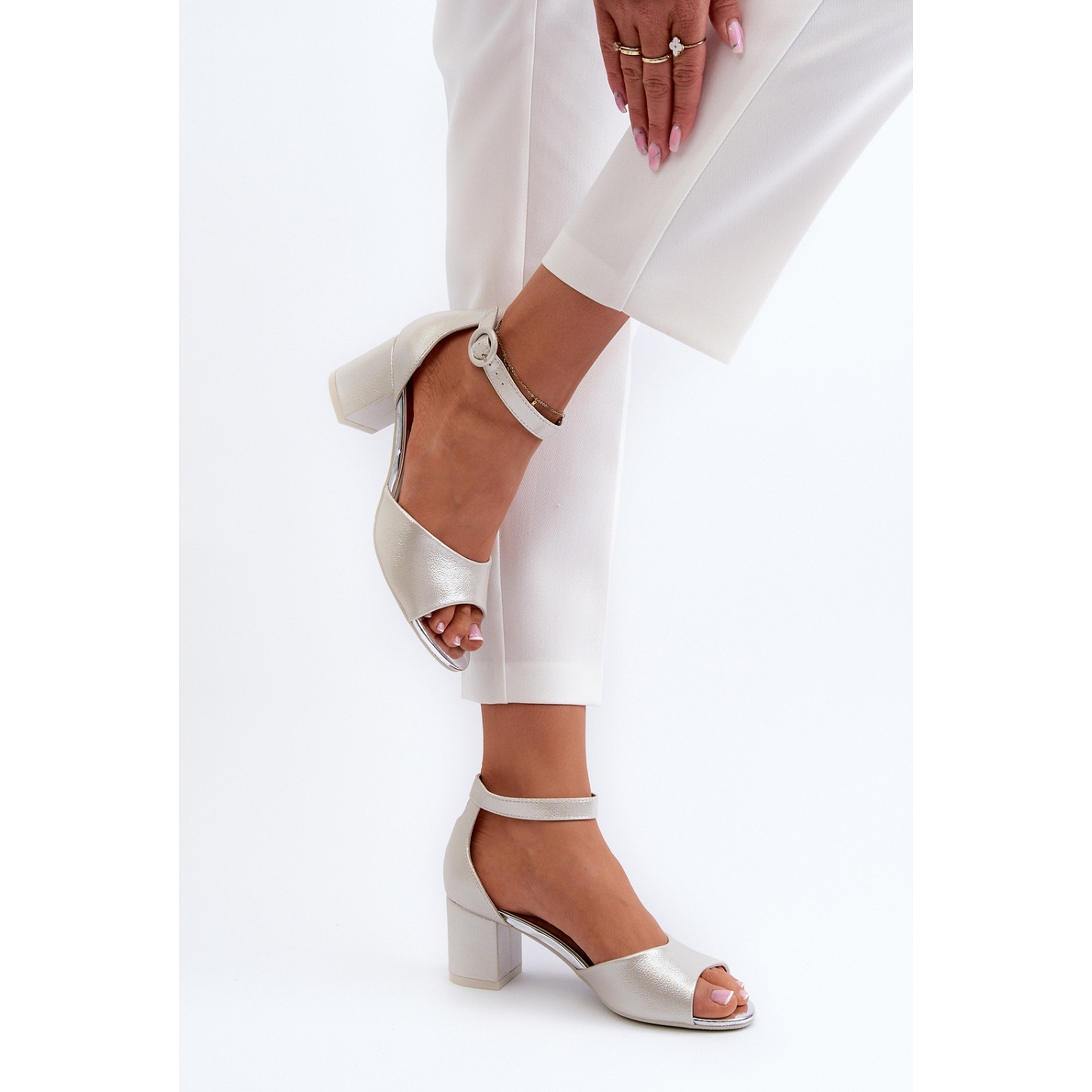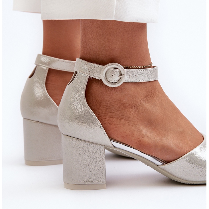 La sujeción alrededor del tobillo con una correa ajustable con hebilla no sólo añade encanto, sino que también garantiza que la sandalia se ajuste perfectamente al pie, garantizando seguridad en cada paso. El color plateado metalizado confiere a los zapatos un carácter único y los hace combinar con muchos estilos diferentes, desde looks informales hasta looks de noche más sofisticados.