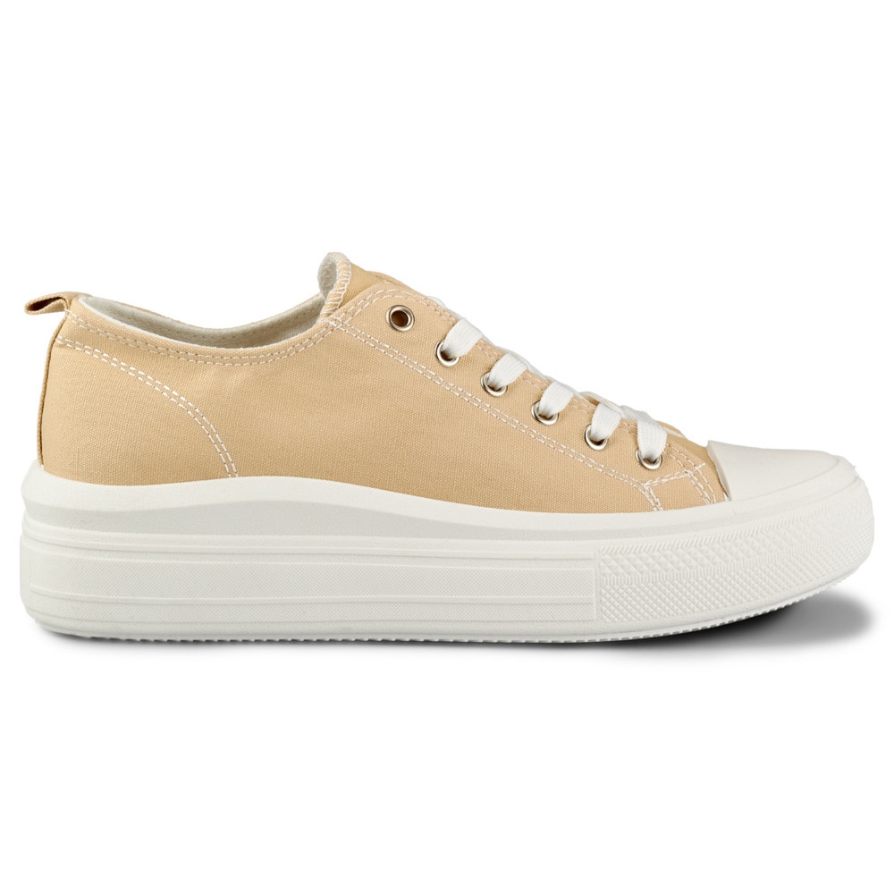 Disfruta de la ligereza de cada paso con unas zapatillas beige con plataforma baja y añade un toque de elegancia sin pretensiones a tus conjuntos.
