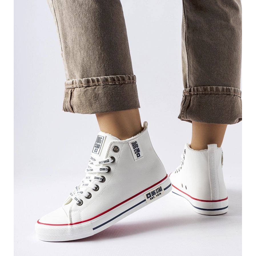 Big Star KK274597 de aislamiento blanco de aislamiento de zapatillas de zapatillas: estilo y comodidad para días más fríos. Estas zapatillas de deporte altas de las mujeres combinan un diseño minimalista de moda con soluciones prácticas: parte superior de cuero ecológico suave y blanco, interior aislado y suela de goma duradera garantizan la comodidad y la protección contra el frío. Una nariz redonda y un cierre atado proporcionan un aspecto clásico y un ajuste preciso al pie.
