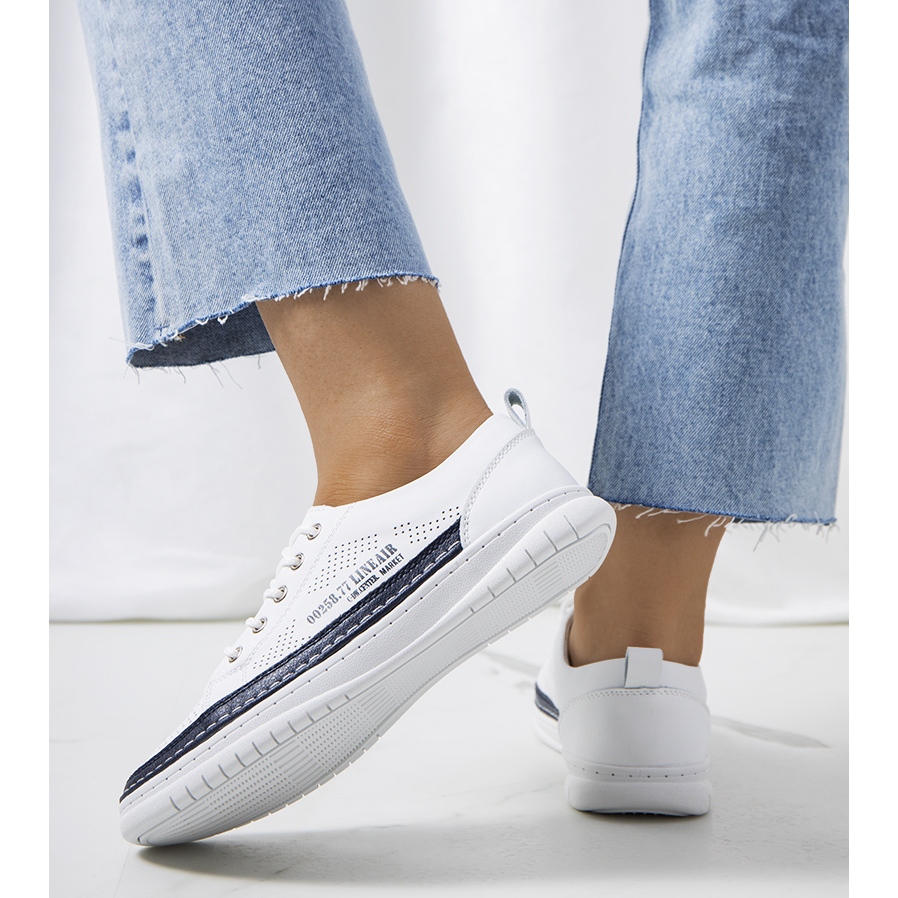 Si buscas un calzado moderno y cómodo, estas zapatillas blancas Valeska de piel en color azul marino sin duda cumplirán tus expectativas. ¡Elígelas y disfruta de estilo y comodidad en cada paso!