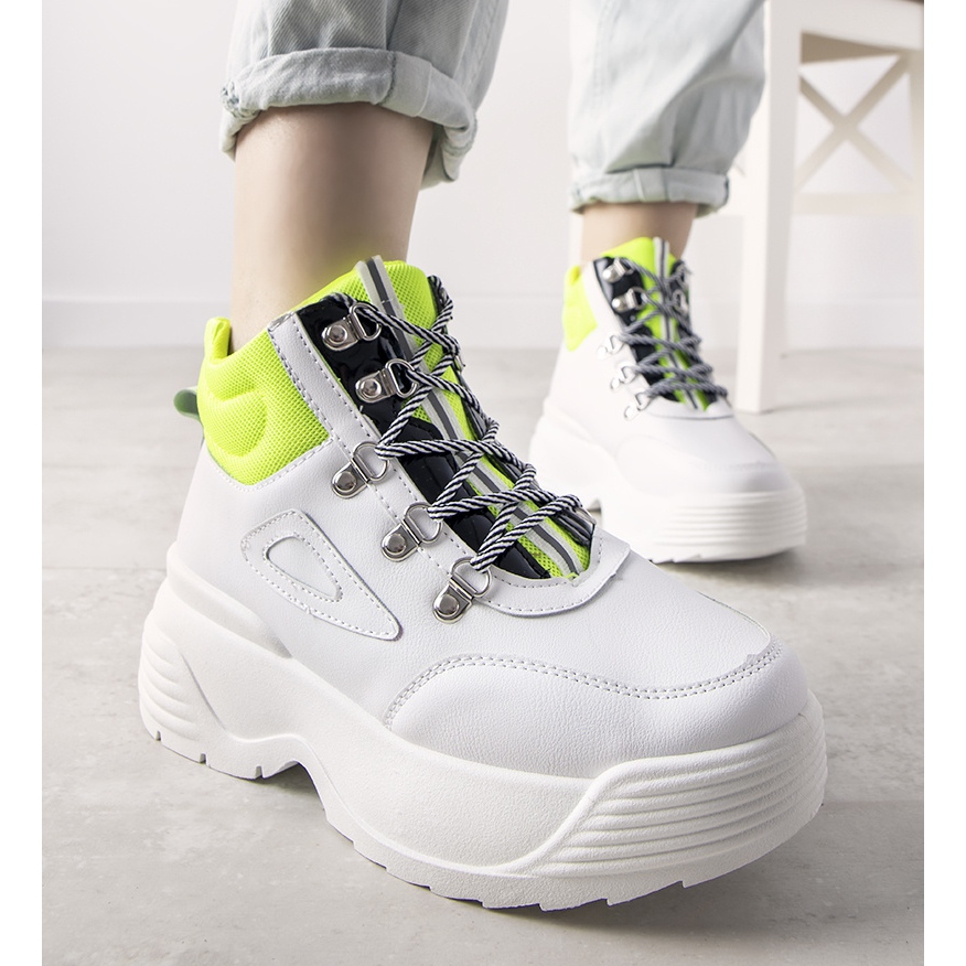 Las zapatillas Eloquence de suela alta son una opción perfecta para los días más fríos, ya que combinan comodidad y diseño moderno. Hechos de cuero ecológico de alta calidad, estos zapatos blancos se distinguen por elegantes inserciones en un inusual color verde neón que realza perfectamente el tobillo.
