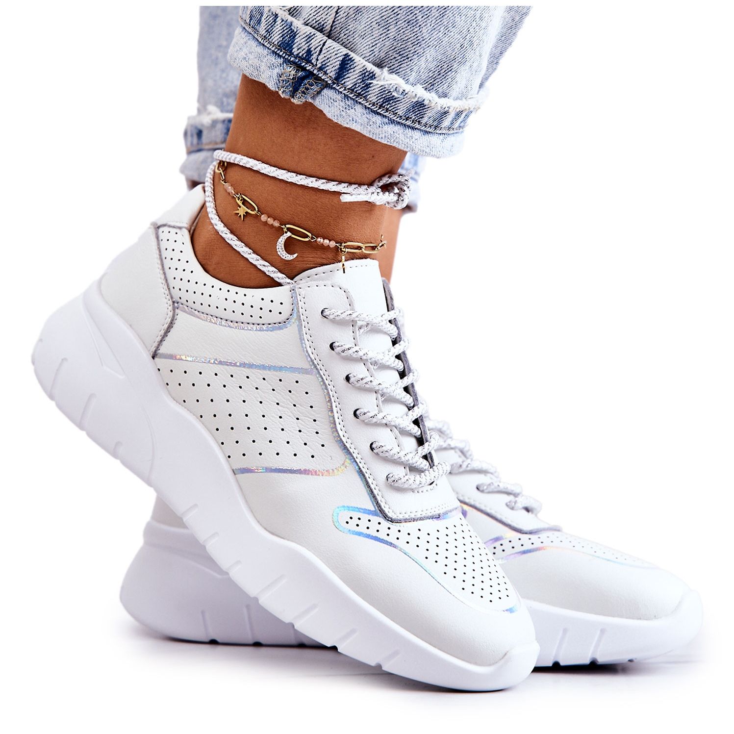 S. Barski Carly: zapatillas blancas clásicas en blanco, combinando comodidad deportiva con un acabado sutil y de moda. Hecho de cuero natural y perforado, proporcionan un buen drenaje de aire y un aspecto elegante. El inserto suave de cuero natural garantiza la comodidad durante todo el día, y la nariz redonda ligeramente alargada y los cordones para los cordones redondos enfatizan su carácter universal. Los insertos holográficos en la parte superior agregan un acento moderno.