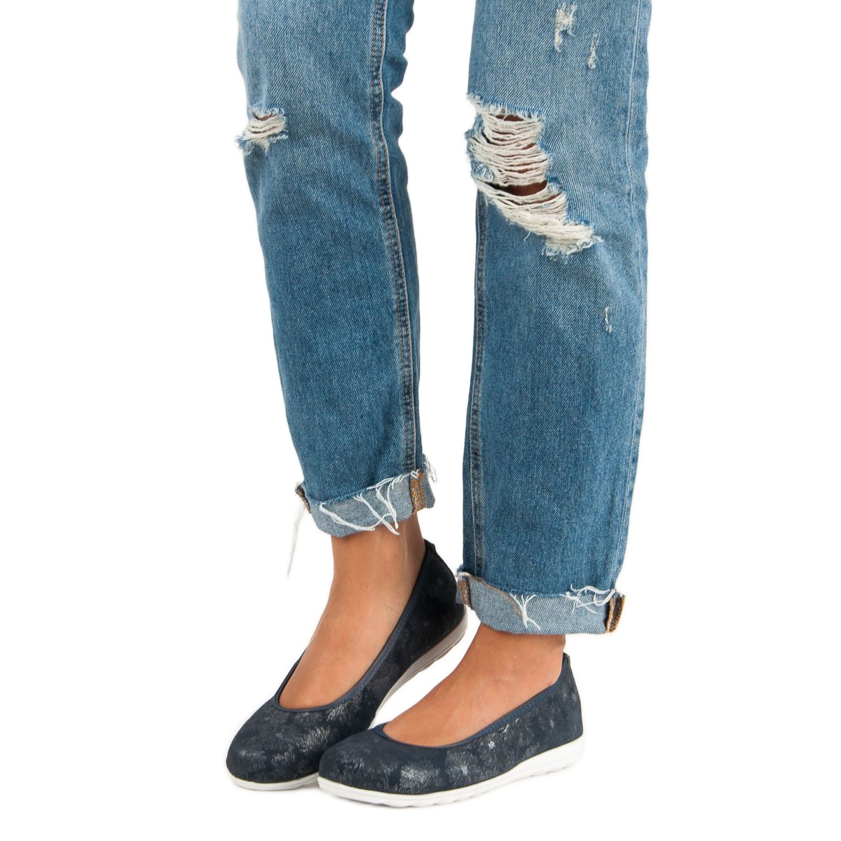 Las bailarinas tienen un tacón suave, lo que aumenta aún más su comodidad, y la inserción de cuero natural garantiza una ventilación adecuada y comodidad de uso durante todo el día. Con una suela blanca rematada con una banda de rodadura inusual, estas bailarinas no solo lucen elegantes, sino que también brindan un excelente agarre.