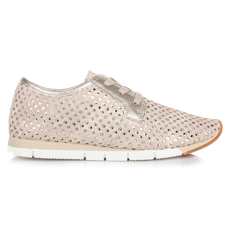 Las zapatillas están confeccionadas en piel ecológica de alta calidad y su estampado calado les aporta originalidad y ligereza. Los colores, una combinación armoniosa de amarillo, dorado, marrón y beige, los hacen combinar con muchos conjuntos diferentes. El interior de los zapatos está forrado con una tela suave, lo que garantiza comodidad incluso cuando se usan durante largos períodos de tiempo.