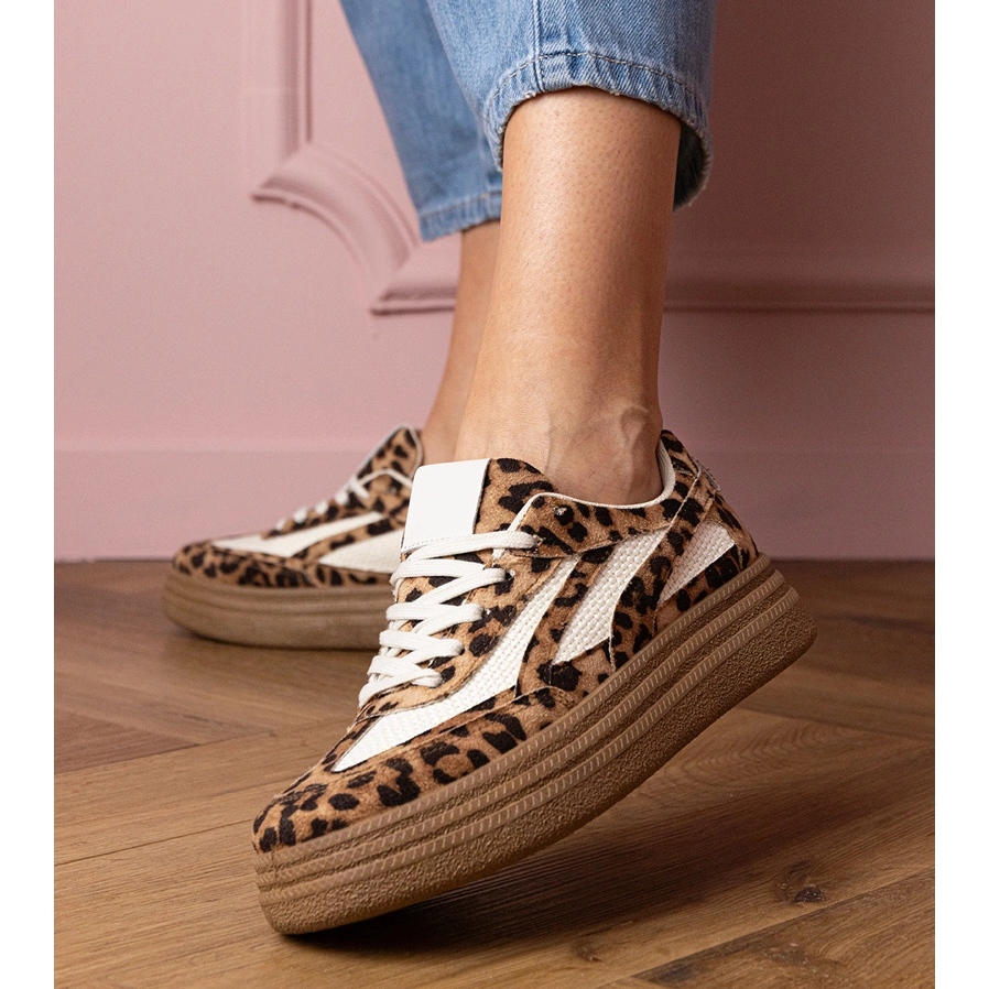 Ofrecemos zapatillas de deporte marrón en una suela gruesa, que son la combinación perfecta de comodidad deportiva con estilo de moda. Estos zapatos únicos con un patrón de leopardo original sin duda atraerán la atención y le permitirán destacar en cada multitud.