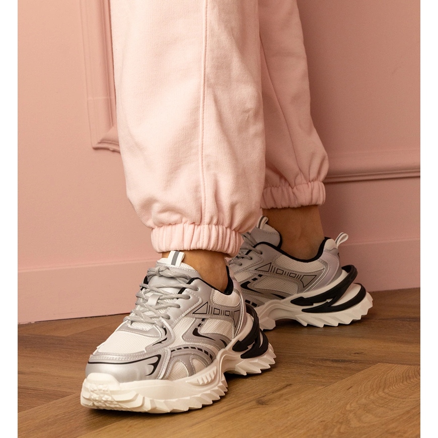 Detalles: Zapatillas de deporte deportivas de plata en una suela gruesa