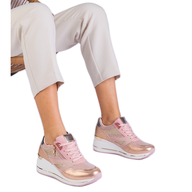 Zapatillas de deporte deportivo rosa en la plataforma decorada con brillo y un inserto metálico
