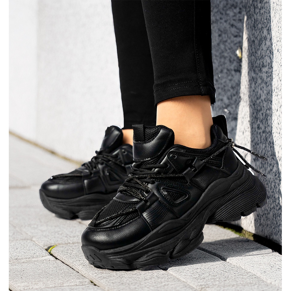La sujeción para los cordones garantiza un ajuste perfecto, y una suela plana garantiza la estabilidad y la comodidad durante cualquier actividad. Las zapatillas de deporte femeninas en la plataforma negra es la elección perfecta a diario y para el entrenamiento, que no solo será práctico, sino también de moda.