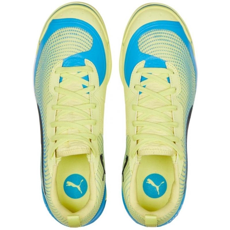 Puma Ibero III IT 106891 01 Zapatos de fútbol - salas azules con acentos verdes. Modelo de la colección Premiere Festest Pack, diseñada como una cómoda introducción a la era de la velocidad del fútbol, la elección perfecta para el entrenamiento y los partidos recreativos interiores.