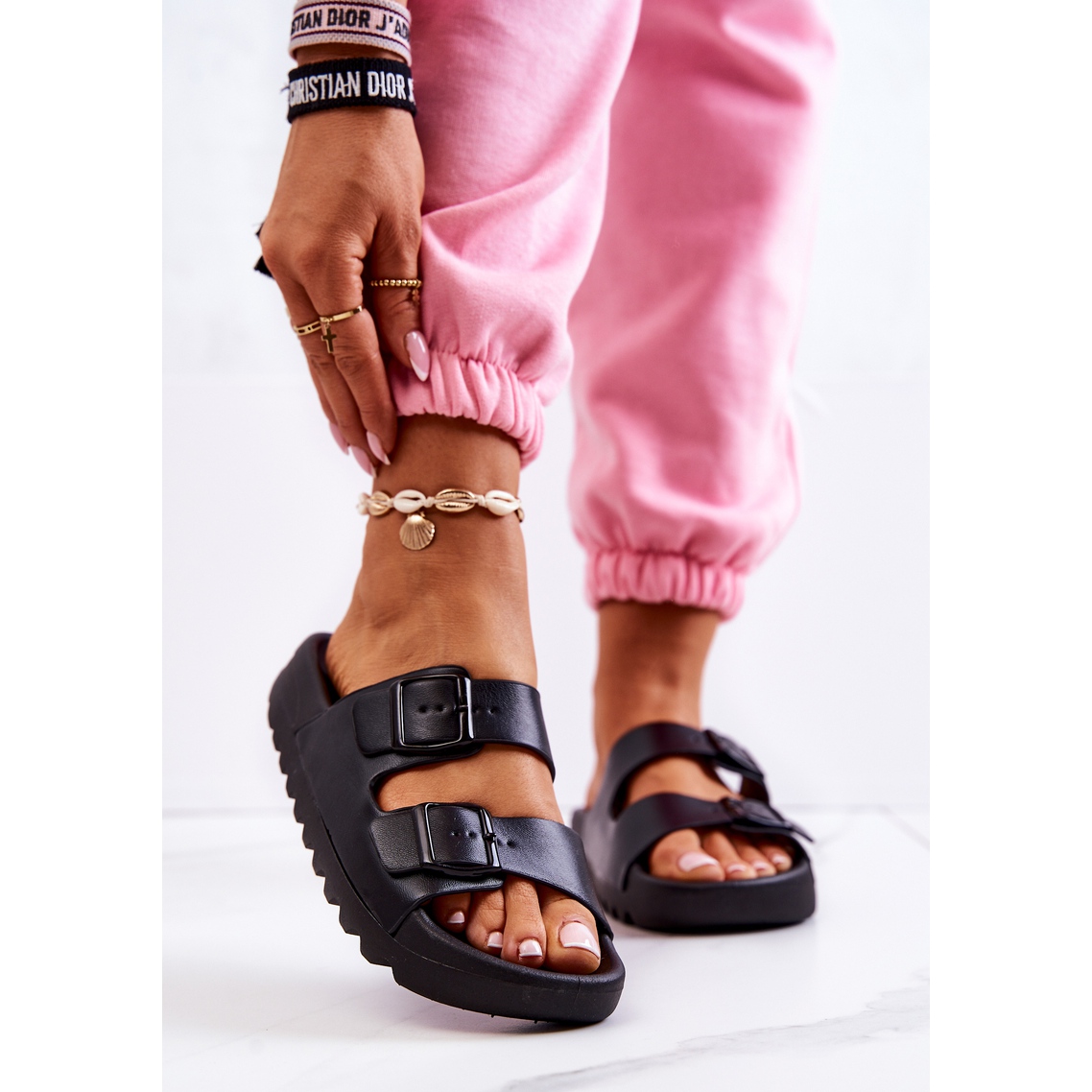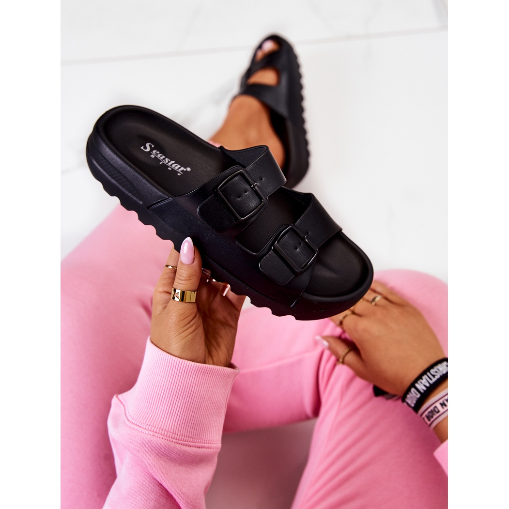 Son perfectas no sólo para la playa, sino también como elegantes chanclas para casa. La altura de la plataforma de 3 cm y la goma espuma utilizada para fabricar la suela garantizan una amortiguación y estabilidad adecuadas. Las chanclas están disponibles en una amplia gama de tamaños y su diseño sin cordones con hebilla hace que calzarlas sea muy fácil.