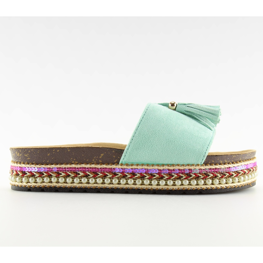 Zapatillas de mujer en una suela alta y perfilada. Lleno de encanto con, entre otras cosas, abalorios en la suela y borlas, todo en compañía de hermosos colores da un efecto sorprendente. ¡No solo son mega cómodos, se ven geniales para eso! Material exterior - gamuza ecológica, forro interior - tejido.