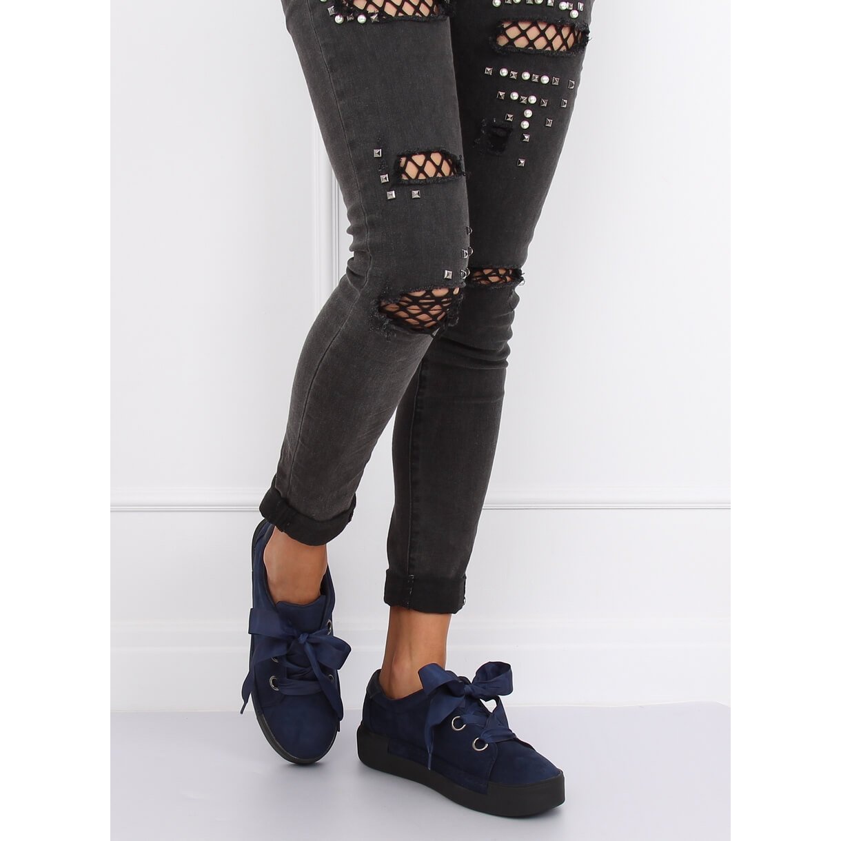 ¡Descubre un estilo único y comodidad con las zapatillas de mujer azul marino 1018 Blue! Confeccionados en ante ecológico, estos zapatos de moda seguramente se convertirán en un elemento indispensable de tu guardarropa diario. Su diseño moderno con suela alta y elegante lazo añade originalidad, y el tenue color azul marino hace que combinen perfectamente con una variedad de estilos.