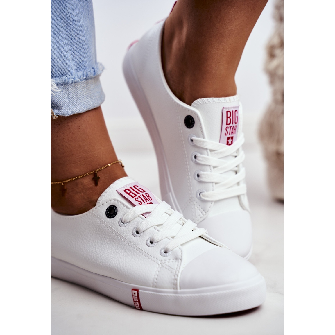 El producto descrito son las zapatillas deportivas Big Star de mujer en color blanco, modelo GG274005. Este calzado se caracteriza por una decoración clásica en forma del logo de la marca ubicado en el lateral de la suela. La parte superior de las zapatillas está fabricada en piel ecológica. Una ventaja adicional es su baja altura de 6 cm, lo que los hace cómodos y se adaptan a muchos estilos. Estos zapatos forman parte de la colección KeeShoes. La suela del zapato es de goma y la plantilla es de tela. Estas zapatillas tienen puntera redonda y cordones. No tienen aislamiento adicional ni tacón y su plataforma es de 2 cm. El embalaje del fabricante es una caja, lo que hace que los zapatos estén listos para regalar. Es recomendable seguir la numeración típica a la hora de elegir una talla.