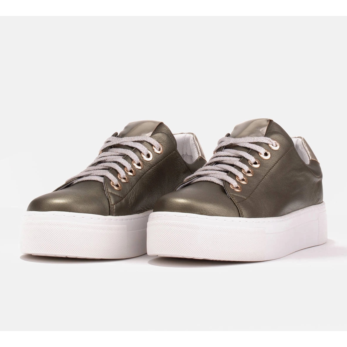 El interior de los zapatos y la plantilla también están hechos de cuero natural, lo que garantiza la comodidad de uso. Los zapatos tienen la punta redonda y se atan, lo que permite un ajuste perfecto al pie. La suela de las zapatillas tiene 4 cm de altura, lo que acentúa aún más su carácter deportivo.