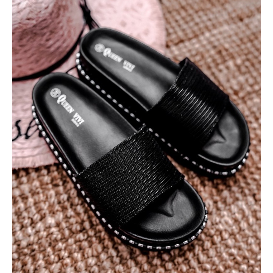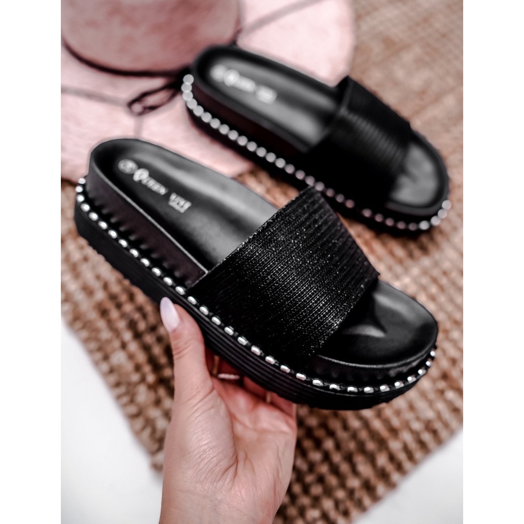 Sandalias de plataforma con franja decorativa con costuras metálicas. La suela está hecha de plástico ligero en negro, que además está decorada con elementos plateados.Al elegir un tamaño, utilice la tabla de tallas.