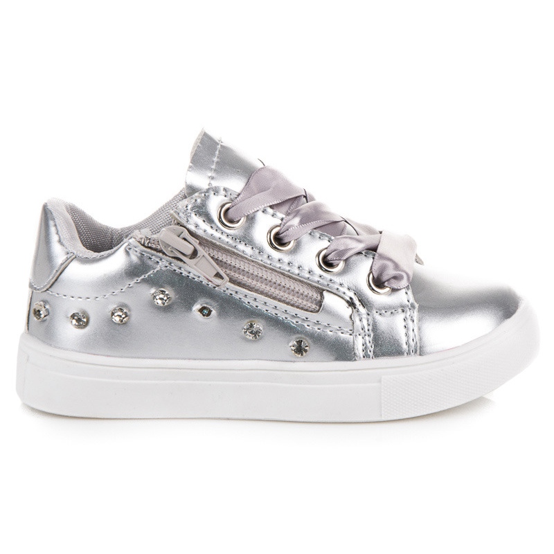 Zapatillas de plata para niñas, decoradas con cristales en el exterior. La plantilla perfilada de cuero natural garantiza la comodidad de uso. Los zapatos atados con una cinta decorativa, también tienen una cremallera. Esta modelo es apreciada por todas las chicas que están interesadas en la moda y les gusta destacar con su vestido. ¡Elige talla y compra hoy!