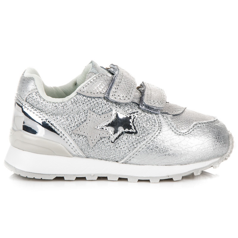 Zapatillas de moda para niños en plata es una necesidad en el armario de la niña. Es un modelo que llama la atención, por el cual nadie pasará. Las zapatillas de deporte propuestas tienen una decoración en forma de estrella. Un acabado que imita la piel de la serpiente merece una atención especial.