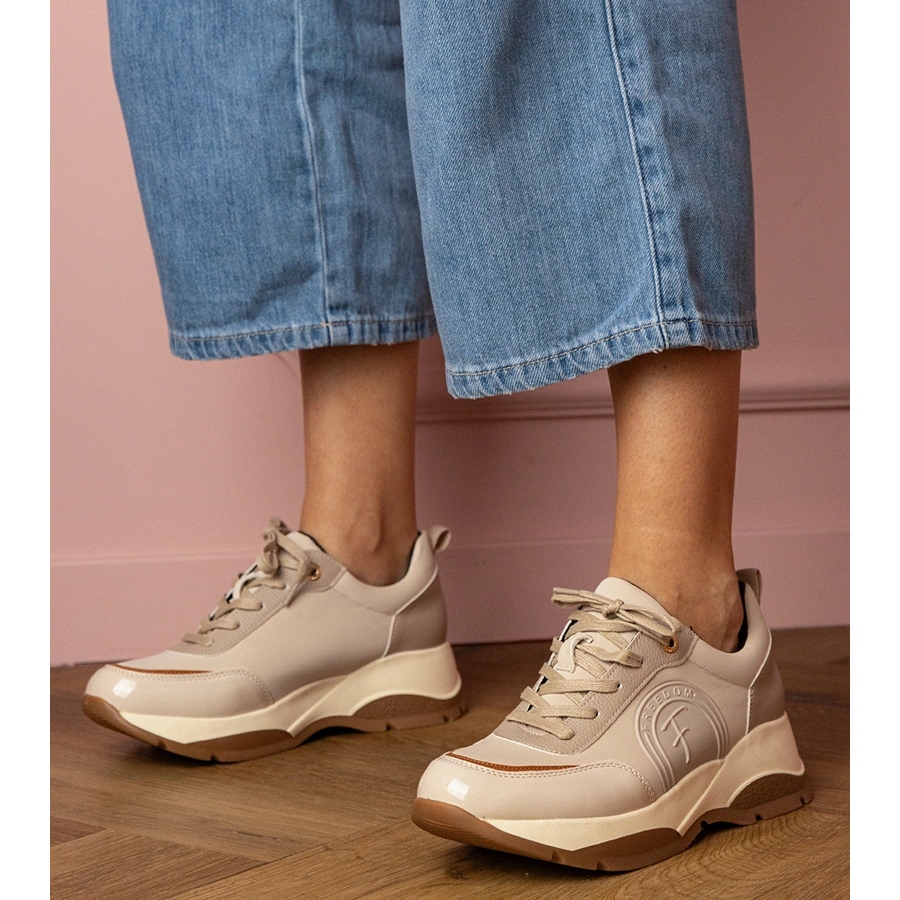 El color beige de los zapatos en combinación con una suela de goma marrón hace que las zapatillas de deporte y se adapten fácilmente a cualquier guardarropa. El acabado barnizado les da estilo, lo que los convierte en la elección perfecta a diario para las mujeres activas que no renuncian a la apariencia de moda.