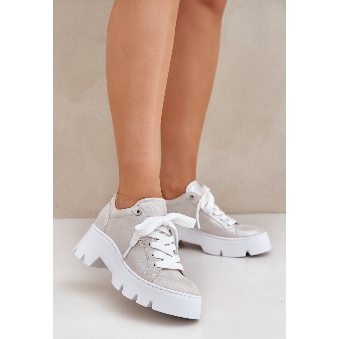 Ubicado en una plataforma de tacón plana de 3.5 cm de altura con una altura de 6 cm, estas zapatillas de deporte ofrecen estabilidad, gracias a la cual son perfectas tanto para caminatas diarias como en un estilo de vida activo. La nariz redonda les da sutilezas, y el color plateado universal se ajusta efectivamente a las últimas tendencias de moda, lo que le permite combinar fácilmente con varias estilizaciones, desde casual hasta más elegante.