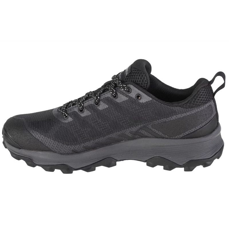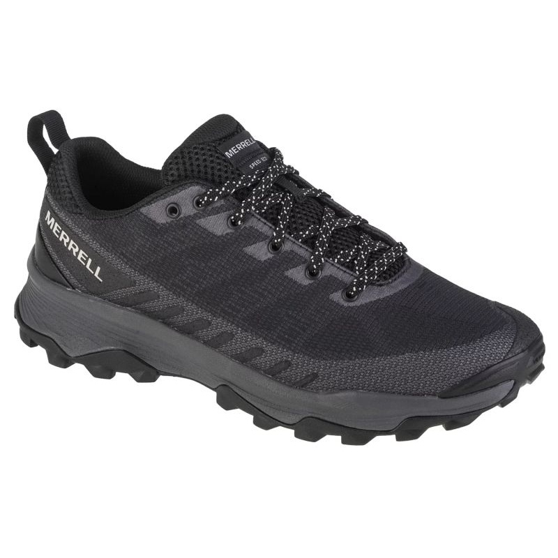 Los zapatos modernos y bajos de Merrell creados para el trekking de montaña y las actividades al aire libre. El diseño negro y tenue se combina con soluciones prácticas: una parte superior duradera hecha de materiales sintéticos, un revestimiento textil y una suela sólida con una banda de rodadura gruesa garantiza la comodidad y la estabilidad en el terreno desigual.