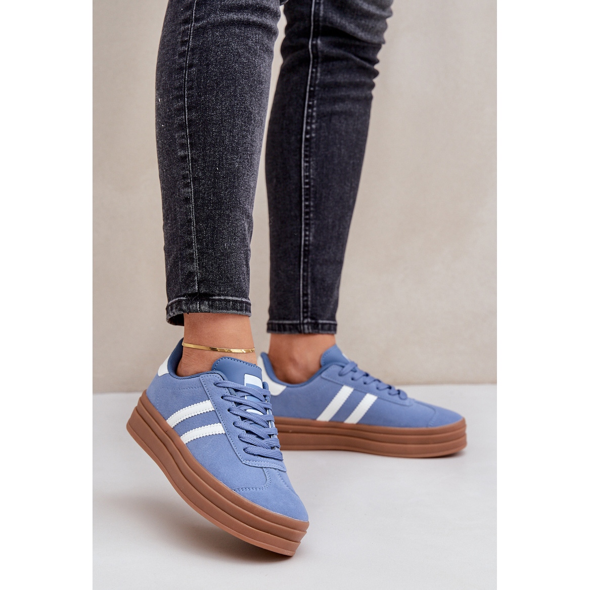 Las zapatillas de deporte tienen un cierre atado, lo que permite un ajuste individual al pie. Gracias a la elegante combinación de color azul con detalles blancos y una suela beige, son una excelente adición a cualquier estilización informal.