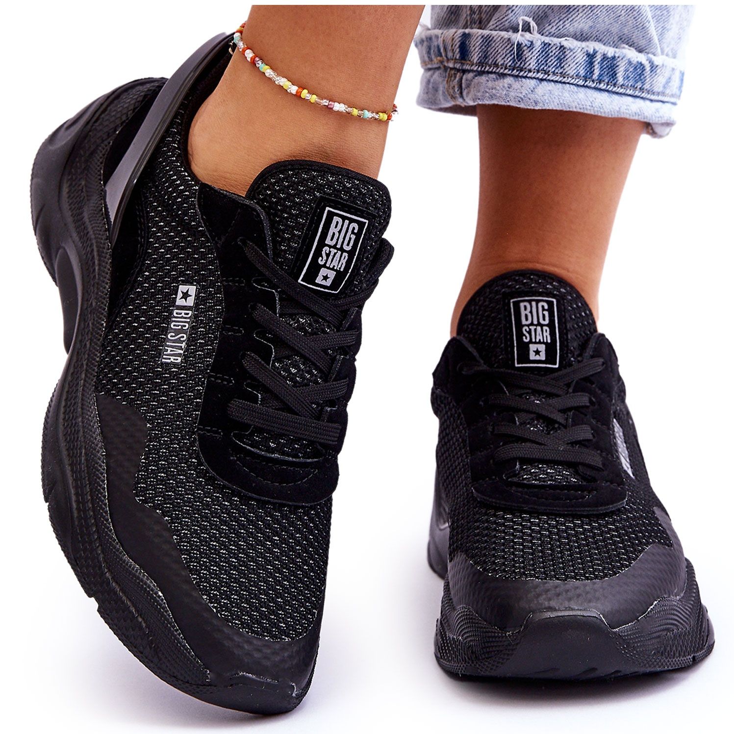 Women's Big Star LL274A065 Sneakers para mujeres: negras, elegantes y cómodas. La combinación de tela con piel ecológica ofrece una apariencia y durabilidad de moda, y el talón reforzado proporciona un mejor apoyo en cada paso. El modelo se coloca en una suela estable con la plataforma, lo que agrega ligereza a la figura, manteniendo la comodidad del uso.