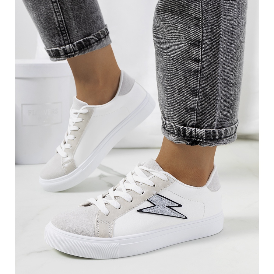 La parte superior de las zapatillas está confeccionada en piel ecológica, decorada con un sutil estampado estilo cocodrilo, que les da un carácter único. Los colores (blanco con un poco de plata y gris) hacen que el calzado combine perfectamente con outfits tanto informales como más elegantes.