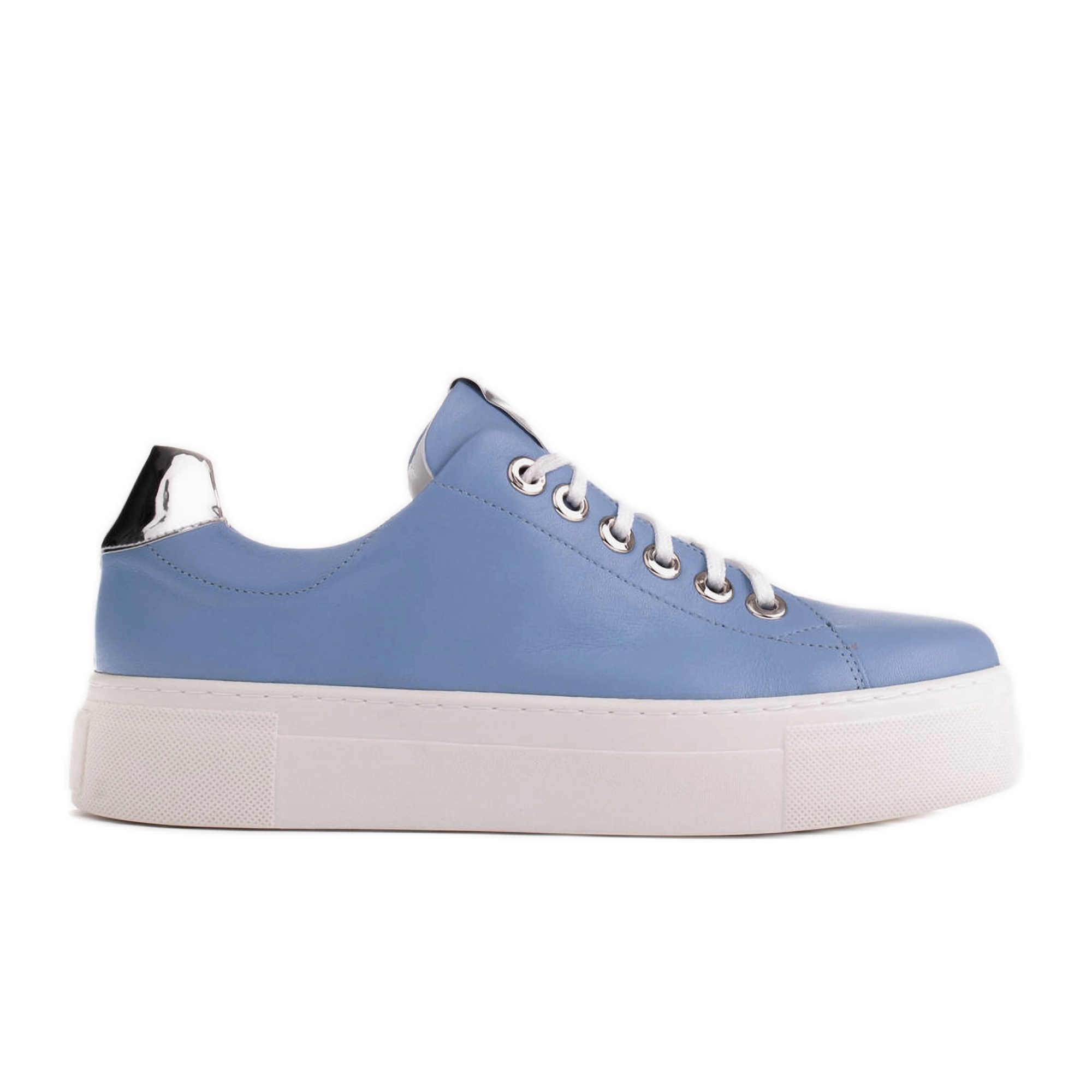 Las zapatillas modernas y cómodas de Marco Shoess de la colección Keeshoes. La combinación de cuero de grano en un tono azul con acentos de plata y una suela blanca y gruesa da el efecto de un estilo ligeramente deportivo y de moda.