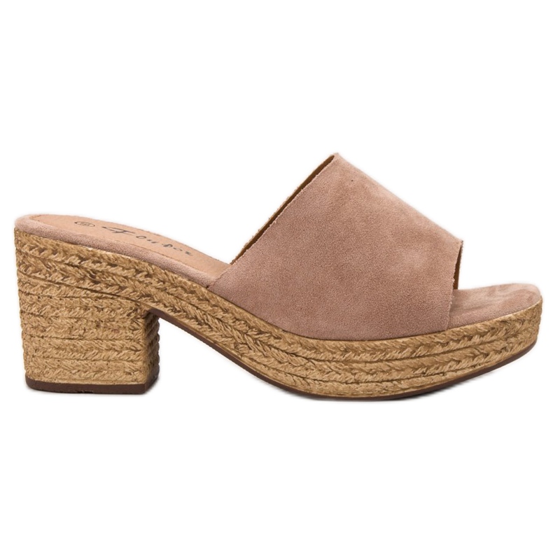 El modelo slip-on garantiza una fácil colocación y un perfecto ajuste al pie, lo que las convierte en una solución ideal para el uso diario. El tono rosa juvenil encaja perfectamente en las tendencias de la temporada y aporta frescura a cualquier estilismo. Gracias a la altura del tacón de 7,5 cm y a la plataforma de 3 cm, estas chanclas no sólo alargan ópticamente las piernas, sino que también garantizan estabilidad y comodidad al usarlas.