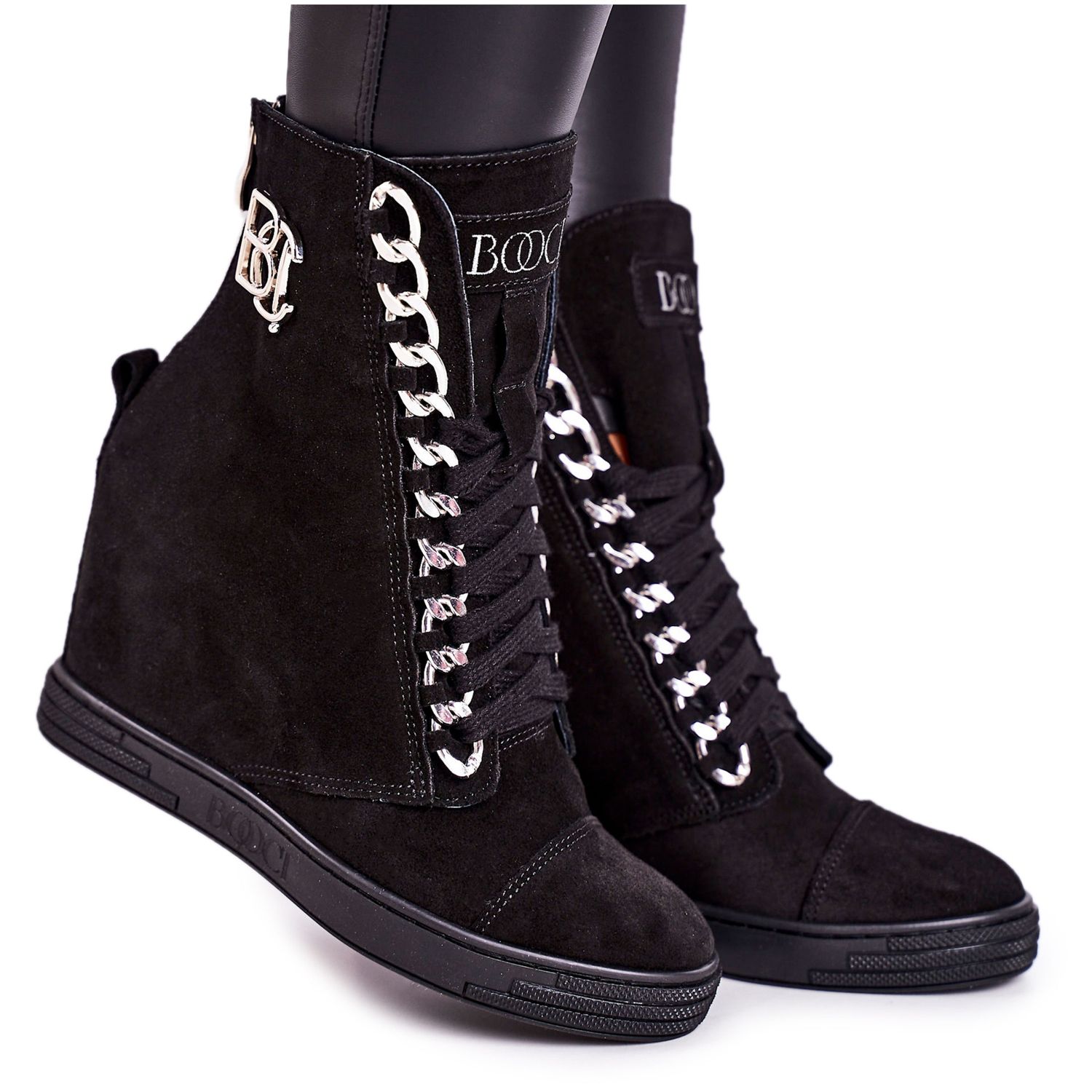 Te presentamos unas deportivas de mujer en ante BOOCI 2222/066/s en color negro, que combinan estilo con comodidad. Confeccionados en ante natural, estos zapatos se distinguen por una cadena plateada que recorre la parte superior, añadiendo un carácter único.