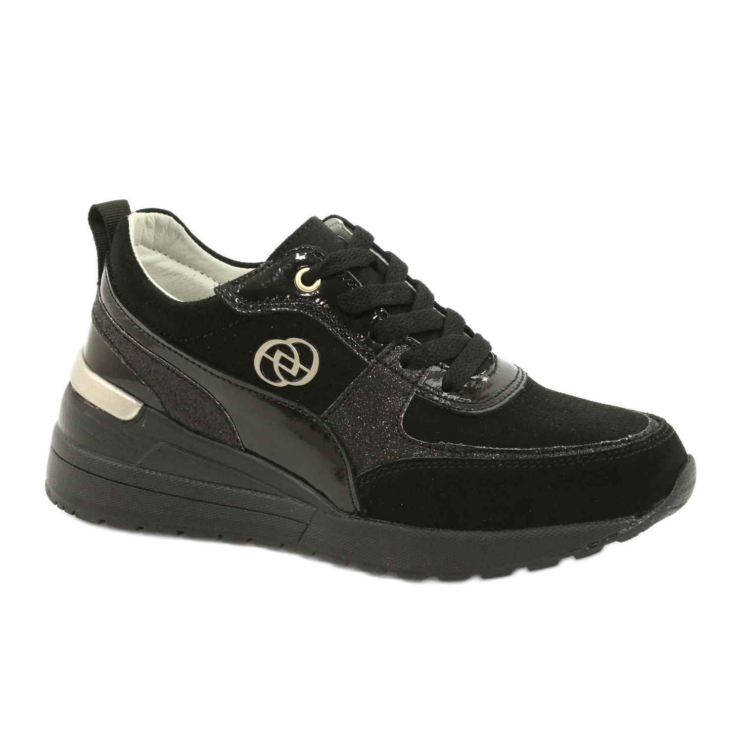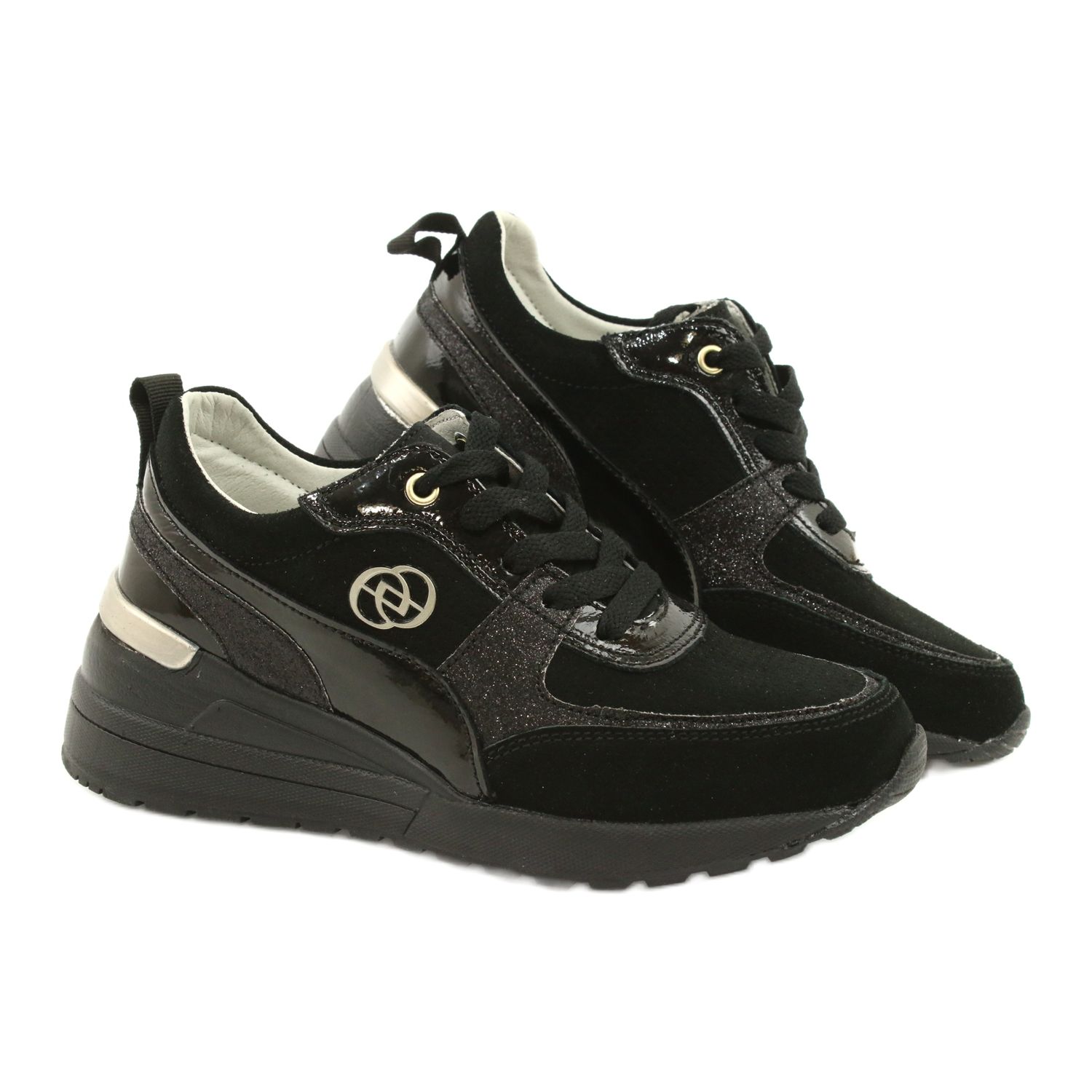Las zapatillas elegantes hechas de cuero de gamuza negra de alta calidad, que combinan un personaje deportivo con una figura femenina. 5,5 cm La cuña agrega esbeltez óptica, y la plantilla de cuero suave proporciona comodidad incluso durante el uso más largo. Las aplicaciones metálicas sutiles y los detalles barnizados le dan a los zapatos un aspecto de moda y terminado.
