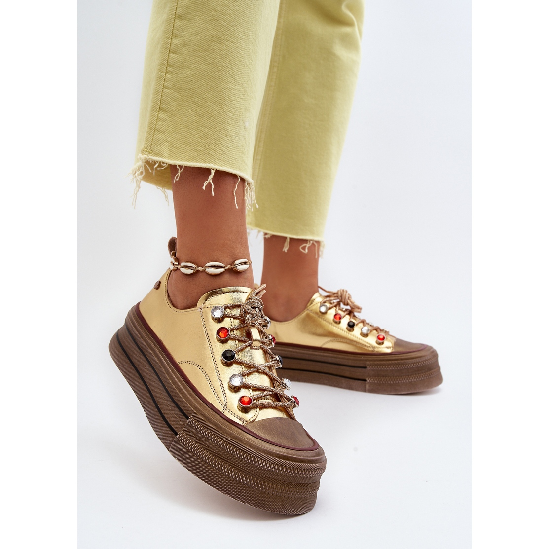 Estas zapatillas llaman la atención no solo por su color, sino también por detalles sutiles como la pedrería que aportan carácter y originalidad. Gracias a la punta redonda y al cierre con cordones, los zapatos son prácticos y fáciles de adquirir.