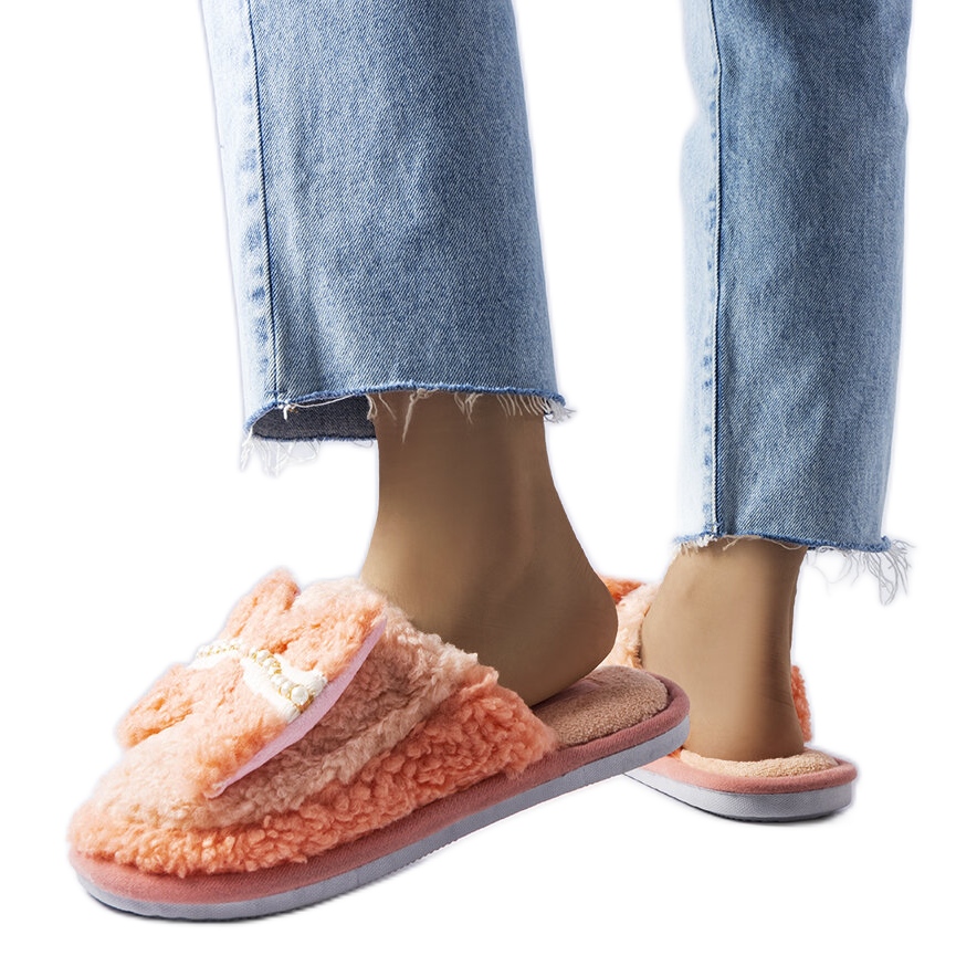 Naranja, las zapatillas insertadas para mujeres con un arco decorativo es una combinación de diseño de moda y máxima comodidad. Interior aislado y una suela de goma blanca adhesiva los hacen perfectos como zapatillas caseras cálidas en los días más fríos.